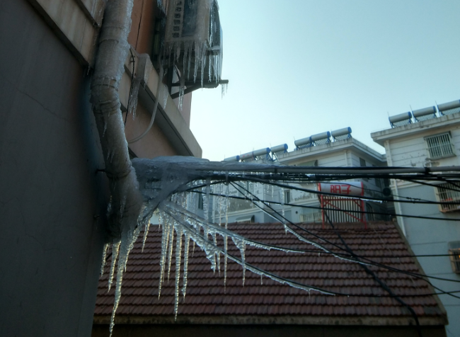 24日下午,淮海農場城南15號樓樓頂出現自來水泄漏現象,泄漏下來的水流不僅把二樓墻壁上的空調凍成了冰凌團子,漏下來的水沿著水管四濺,造成二樓的主樓梯口成了水簾洞,臺階也成了易滑跟頭的冰臺階。無論是空調還是臺階甚至高懸在頭頂的冰凌,都存有極大的安全隱患。