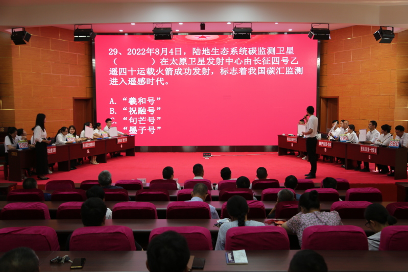 本次比賽分為兩個階段進行,在6月25日的預賽中,全場18支代表隊進行了筆試考核,通過每隊總比分,選出了今天6支參加決賽的隊伍。在主持人的宣布下,比賽正式拉開帷幕?!罢埪狀},黨的二十大報告指出……請開始搶答?!薄罢?號臺答題,三號臺搶答犯規(guī)……”在現(xiàn)場,6支代表隊“八仙過海各顯神通”,大家“邊賽邊學”、“以賽促學”,在必答題、搶答題和風險題3個環(huán)節(jié)上充分發(fā)揮團隊力量,傾力配合。各支代表隊你追我趕,互不相讓,臺下觀眾也聚精會神,對著屏幕學習黨的二十大知識,現(xiàn)場不時發(fā)出熱烈的掌聲。在每個環(huán)節(jié)休息階段,大會還組織開展了現(xiàn)場互動答題,并準備了精美禮品。現(xiàn)場觀眾紛紛踴躍搶答,再度將本次競賽活動氣氛推向了頂峰。