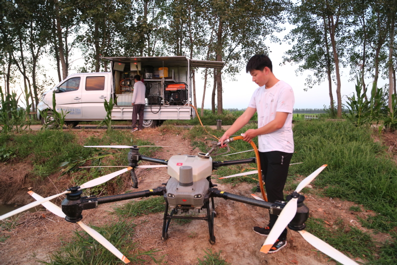 “這塊地是梯形的,等會這塊地飛完,要把地邊找一找,防止漏飛。”8月30日晚,在蘇墾農發崗埠分公司王溝生產區葛莊隊的一處田邊,大隊管理員葛高樹正和無人機飛手進行交流,叮囑操作注意事項。在田間,一架大型無人機閃爍著燈光,在飛手的操作下有條不紊地進行噴施作業,所到之處卷起陣陣白霧。