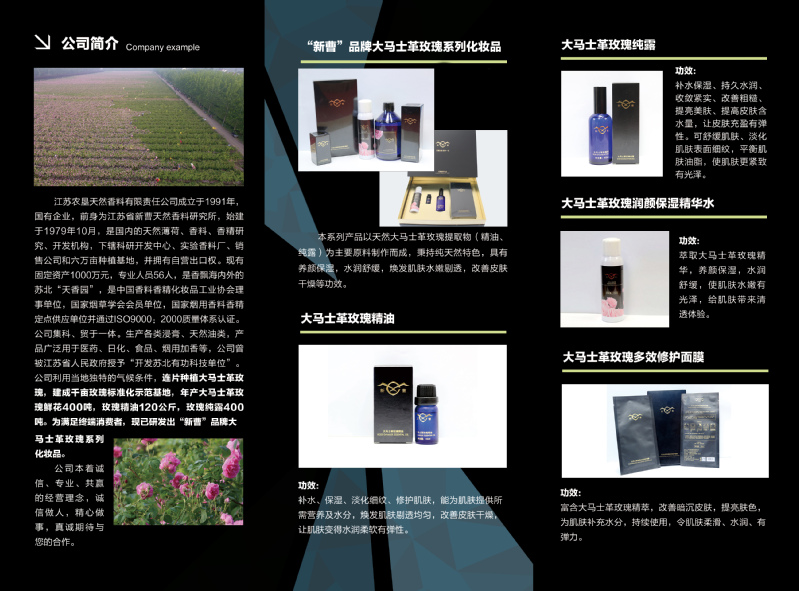 “新曹”牌大馬士革玫瑰系列產(chǎn)品:我公司與上海愛(ài)伽儷日用品公司聯(lián)姻,生產(chǎn)出“新曹”牌大馬士革玫瑰面膜、精華液、純露、復(fù)方精油系列化妝品。新曹香料人始終堅(jiān)持產(chǎn)品高起點(diǎn)、高品質(zhì),工薪階層價(jià)格定位,深受北京、上海、廣東、深圳等一線(xiàn)城市消費(fèi)者喜愛(ài)。