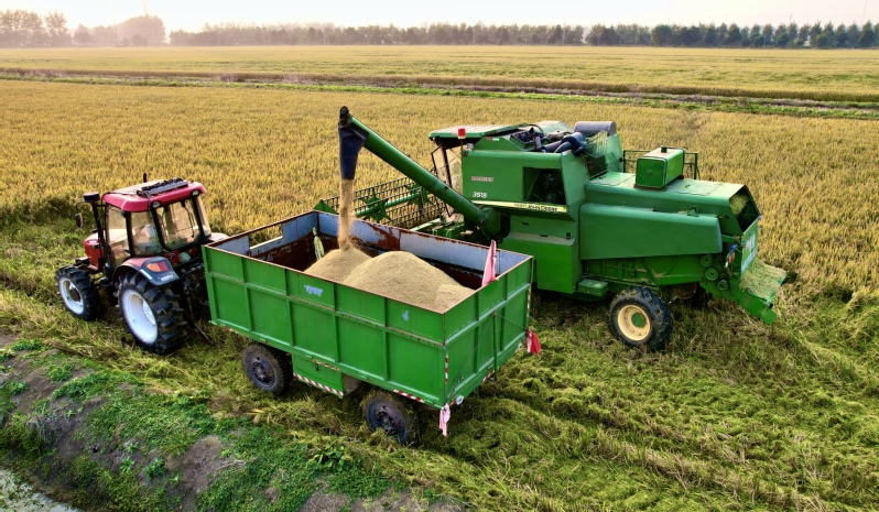 收割、脫粒、粉碎秸稈一氣呵成,色澤金黃、顆粒飽滿的水稻被裝入運糧車中送到曬場。今年“三秋”工作,復興圩分公司狠抓機械收割質量,牢固樹立“減損就是增收”的理念,各大隊加強收割作業質量檢查力度,強調質量第一,確保秋糧“豐收在望”變為“豐收到手”。