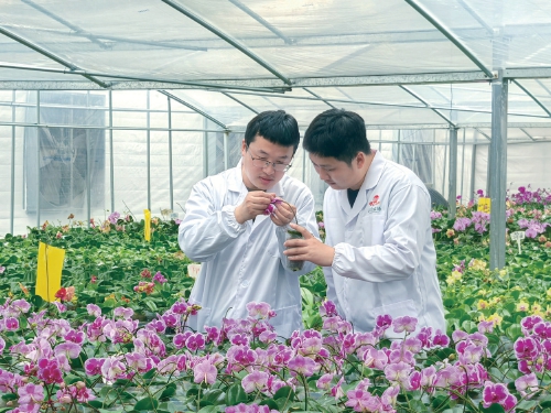 圖為農場技術人員正在查看蝴蝶蘭種苗。 受訪者供圖