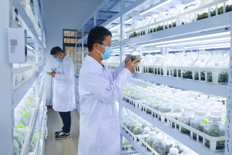 在江蘇農(nóng)墾云臺農(nóng)場的蝴蝶蘭培養(yǎng)室里,培養(yǎng)架上排列著一瓶瓶嫩綠的幼苗。通過精準(zhǔn)調(diào)控光照波長、濕度梯度和營養(yǎng)配方,不僅可以縮短蝴蝶蘭育苗周期,還能顯著提高苗子的成活率和抗病性。圖為技術(shù)人員在開展日常蝴蝶蘭幼苗培育觀測工作,并同步系統(tǒng)記錄生長數(shù)據(jù)及環(huán)境調(diào)控參數(shù)。