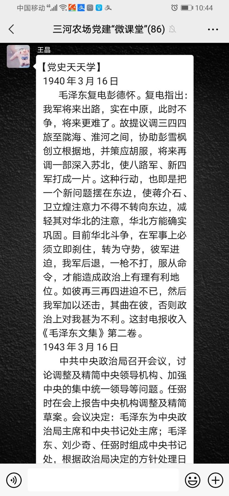 在全黨開展黨史教育之際,三河農(nóng)場公司在利用櫥窗、LED大屏、黨建群、微信、美篇等學習的基礎(chǔ),于3月16日利用黨建微課堂平臺開設(shè)“黨史天天學”專欄,每日在群內(nèi)推送黨史故事,黨史知識,黨史上的今天等內(nèi)容,引導(dǎo)黨員通過學習黨史來汲取智慧和力量,滋養(yǎng)初心和使命。