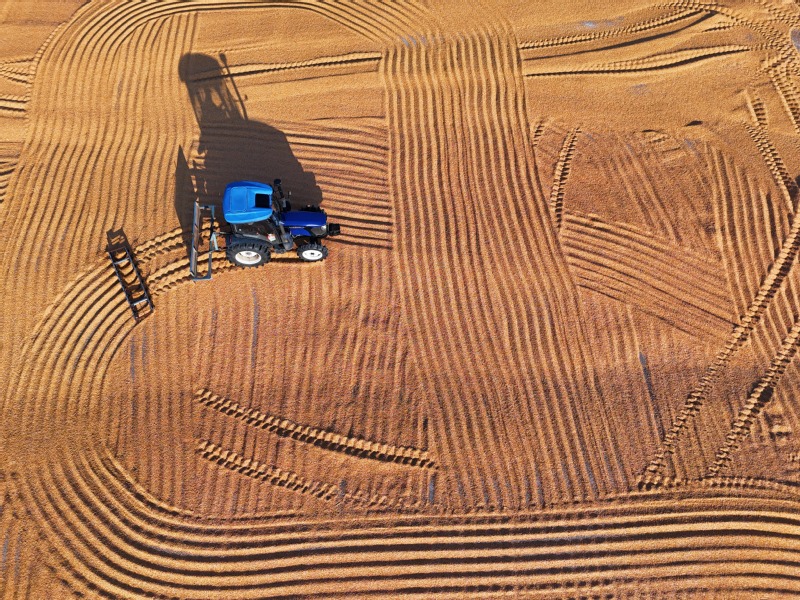 2025年10月9日,江蘇農(nóng)墾崗埠農(nóng)場(chǎng),職工駕駛糧食翻曬機(jī),利用晴好天氣抓緊翻曬剛剛收獲的玉米,確保秋糧顆粒歸倉(cāng)。