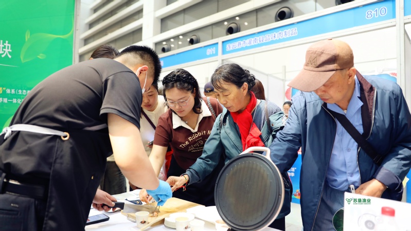 在剛剛結束的2025“蘇新消費·夏夜生活”暨連云港第六屆網絡購物節上,蘇墾漁業的鮮蝦餅、金沙蝦球、蝦滑等對蝦系列產品開售兩小時便被搶購一空。圖為顧客現場品嘗對下系列產品。