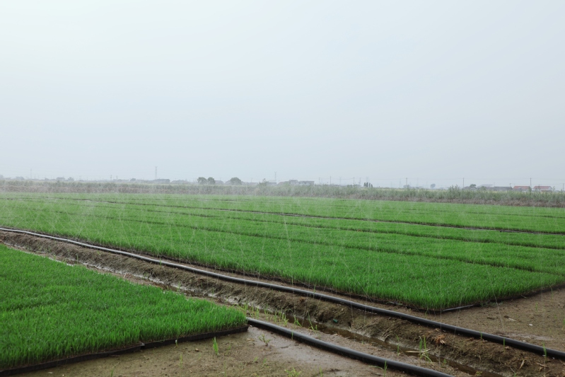 在蘇墾農發崗埠分公司田頭,職工們正在把經“暗化”后的秧盤移到大田里,采用微噴灌技術進行集中育秧,加強精準水肥調控、集中標準化育秧管理,為即將開展的機插秧作業夯實基礎。