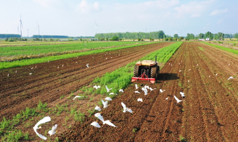 5月25日,蘇墾農發弶港分公司第二生產區8連田間,北斗衛星導航鏟運機、激光平整機等25臺套大型機械來回穿梭,全力推進土地平整進度。