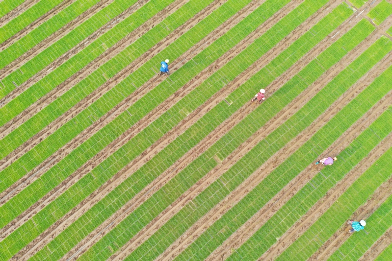 5月29日,蘇墾農發江心沙分公司工人在田間忙著揭膜煉苗、躬身巡苗、定點查苗,為肥水管理和病蟲害防治提供參考,確保育出適齡壯秧,按時移栽。